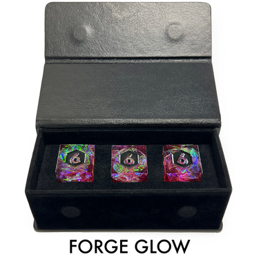 Three d6s in a color of your choice, nestled in an elegant case! You can choose any of the nine resin colors or you can go with semi-precious stone.